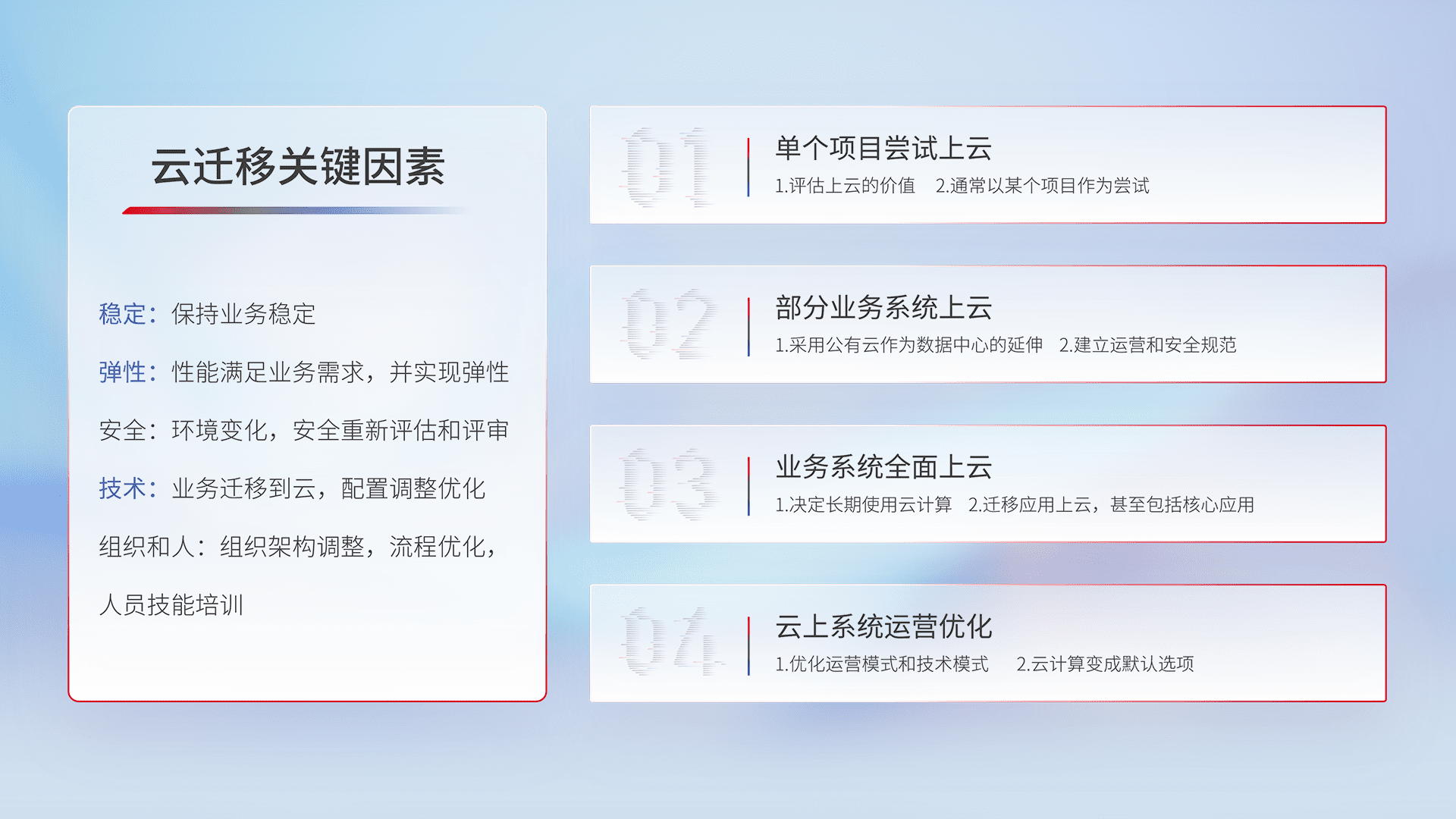 结合实际业务,,,从规划设计、、、、云平台选型、、、、云原生改造、、数据迁移、、、集成交付,,,,迁移全过程为客户识别最佳上云路径,,,做好风险识别管理,,,设计网络架构、、身份权限、、、安全审计合规、、操作审计、、日志审计、、、监控告警策略、、多站点容灾设计等,,对云上基础设施进行整体规划,,,,提升IT治理水平,,,以满足弹性、、高可用、、、高性能的需求。。