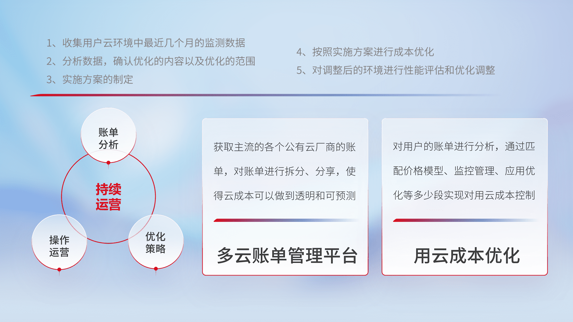 通过多云纳管,,,,以统一的资源数据模型把客户的云资源进行抽象和封装,,进而实现对多云资源的统一操作,,保障云资源管理的可靠性、、稳定性与可用性。。量身定制化运维内容,,,,配置、、、、开发运维、、、补丁管理、、、、备份、、、、监控、、、、认证和访问管理、、审计和日常巡检等,,,保障在用云过程中的可靠度,,稳定度以及高可用率。。。。