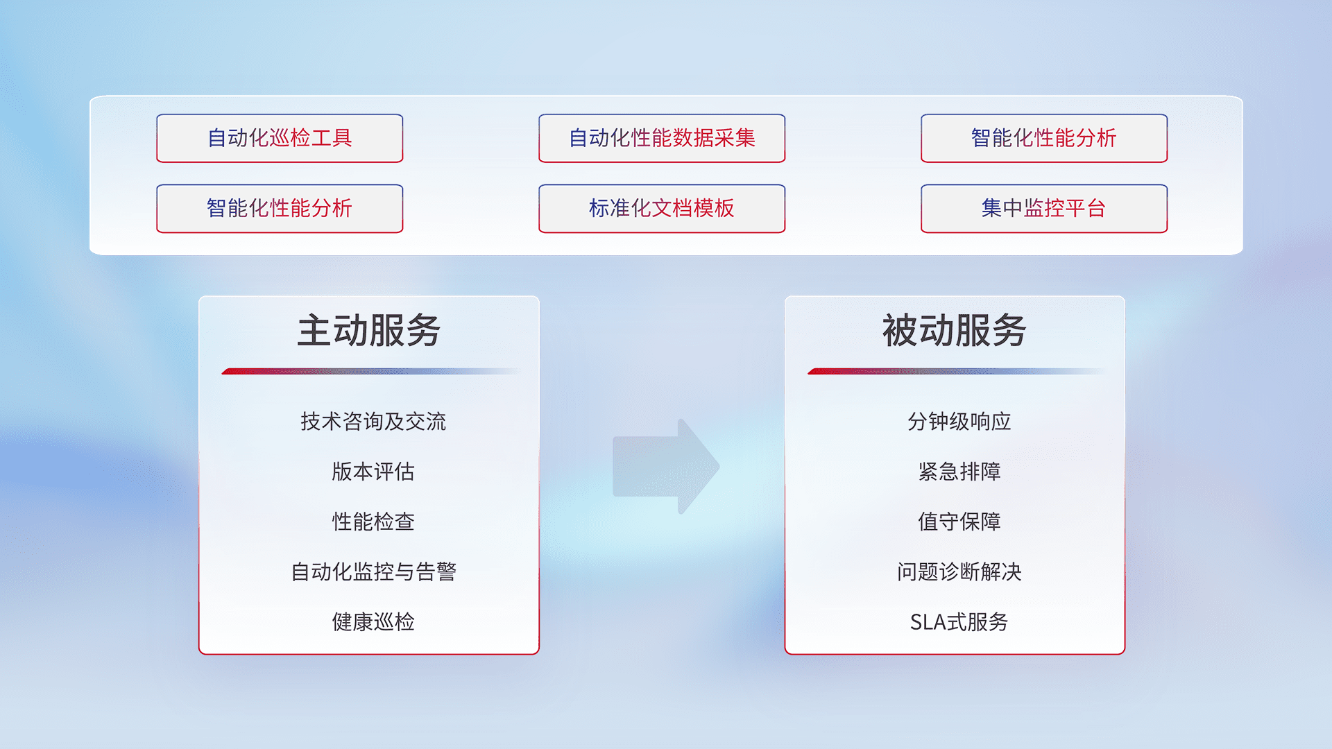 智能化工具和标准化文档,,,,保障服务质量,,,,提供主动服务(包含技术咨询、、、版本评估、、、、性能检查、、、、自动化监控与告警、、、、健康巡检)和被动服务包含(分钟级响应、、、、紧急排障、、、、值守保障、、、问题诊断解决、、、SLA服务)。。。。
